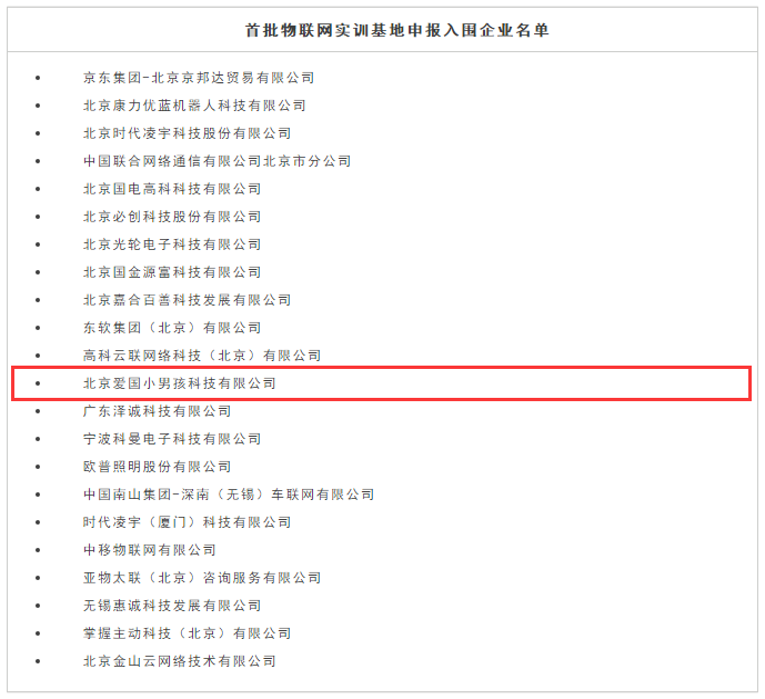 在中關(guān)村物聯(lián)網(wǎng)產(chǎn)業(yè)聯(lián)盟《物聯(lián)網(wǎng)實訓基地企業(yè)征集申報通知》發(fā)布后,愛國小男孩作為先進的物聯(lián)網(wǎng)企業(yè),積極響應聯(lián)盟的號召,并咨詢申報。截止4月中旬,在短短的10余天時間,經(jīng)過物聯(lián)網(wǎng)實訓基地企業(yè)評審專家委員對申報企業(yè)進行初步評審后,發(fā)布首批物聯(lián)網(wǎng)實訓基地企業(yè)入圍企業(yè)。愛國小男孩科技憑借自身優(yōu)勢,成功入圍首批物聯(lián)網(wǎng)實訓基地企業(yè)。