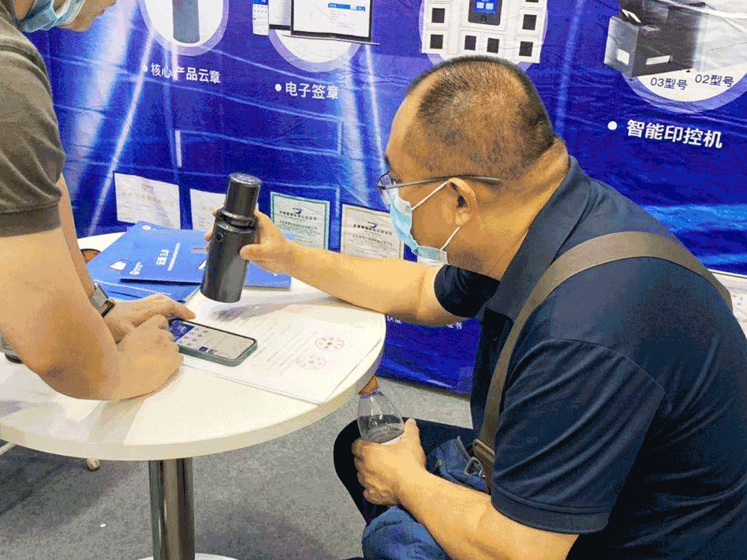 在展會現場,由愛國小男孩工作人員為參展人員介紹云章及蓋章機、云章柜等產品的功能優勢和創新性。并向眾多訪客就云章產品進行了操作演示,讓訪客切實的體驗了一把蓋章新方式。