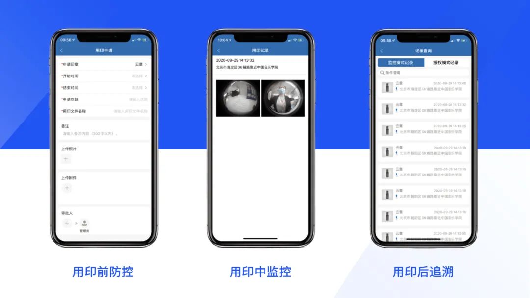 智能云章針對實體印章端的管理,制定了“用印前防控--用印中監控--用印后追溯”全程閉環式智慧管理方案。