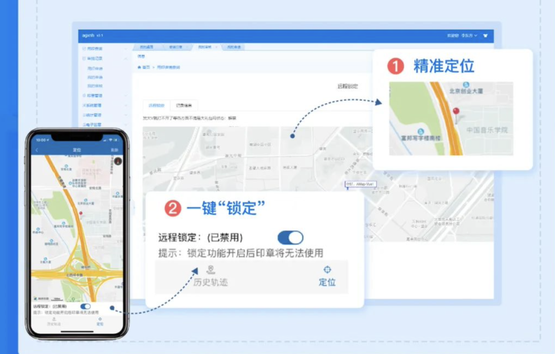 智能云章配備北斗導航定位系統,使管理者隨時隨地查看印章使用記錄、活動軌跡。當監測到異常蓋章情況時,管理者可在線上點擊“遠程鎖定”按鈕,及時防止違規用印行為。