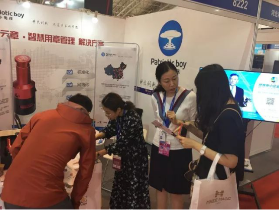 北京愛國小男孩科技有限公司作為國家級高新技術企業,參加了此次科博會,在展會現場為各行業人士集中展現了云章如何杜絕公章被亂用、盜用等給企業造成損失的違法行為,并為政府或企業提供了標準化、網絡化、信息化的用章管理解決方案。