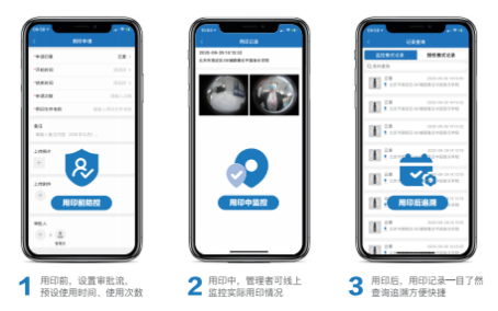 智能印章采用云平臺、客戶端(手機App和Web)及智能終端三位融合的交互方式,通過鏡頭記錄每一次蓋章的過程:使用人、對象、時間、地點,確保用印過程可防控、可監管、可查詢、可追溯,防范用印風險,真正解放印章管理者工作壓力,降低風險。