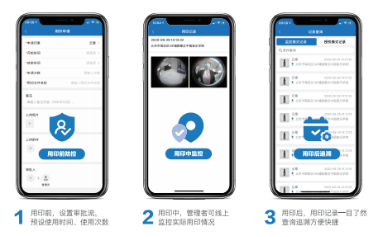 智能印章采用云平臺(tái)、客戶端(手機(jī)App和Web)及智能終端三位融合的交互方式,通過鏡頭記錄每一次蓋章的過程:使用人、對(duì)象、時(shí)間、地點(diǎn),確保用印過程可防控、可監(jiān)管、可查詢、可追溯,防范用印風(fēng)險(xiǎn),真正解放印章管理者工作壓力,降低風(fēng)險(xiǎn)。