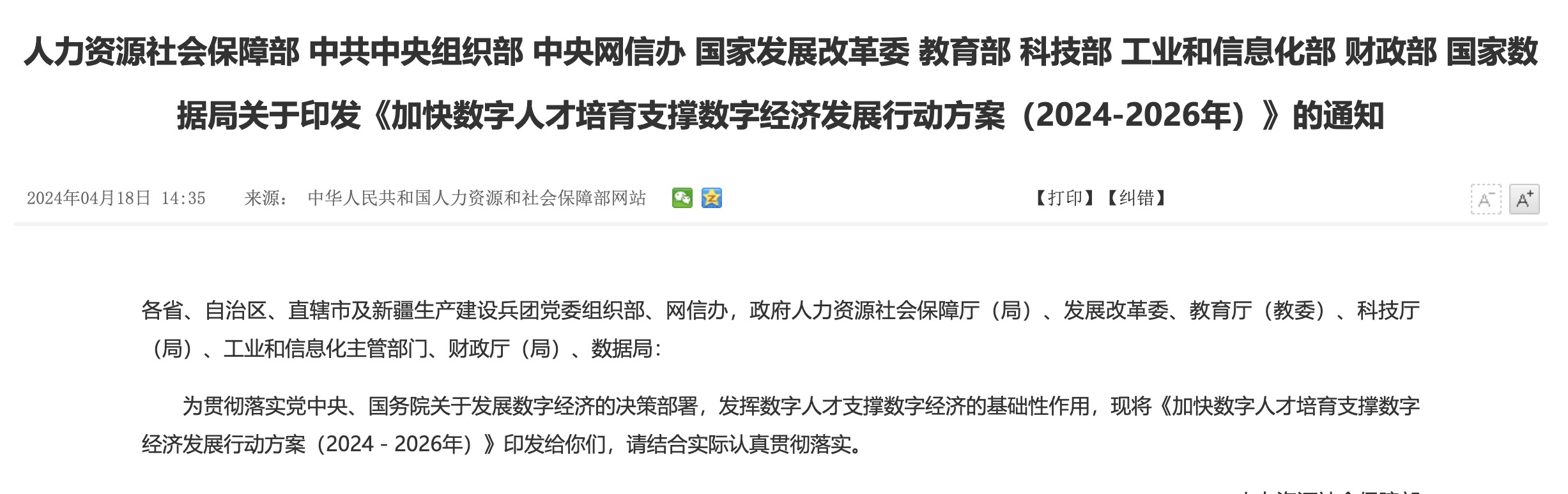 人力資源社會(huì)保障部等九部門(mén)日前聯(lián)合發(fā)布了《加快數(shù)字人才培育支撐數(shù)字經(jīng)濟(jì)發(fā)展行動(dòng)方案(2024—2026年)》,提出要緊貼數(shù)字產(chǎn)業(yè)化和產(chǎn)業(yè)數(shù)字化發(fā)展需要,通過(guò)數(shù)字技術(shù)工程師培育項(xiàng)目、數(shù)字技能提升行動(dòng)、數(shù)字人才國(guó)際交流活動(dòng)、數(shù)字人才創(chuàng)新創(chuàng)業(yè)行動(dòng)、數(shù)字人才賦能產(chǎn)業(yè)發(fā)展行動(dòng)、數(shù)字職業(yè)技術(shù)技能競(jìng)賽活動(dòng)6個(gè)重點(diǎn)項(xiàng)目,用3年左右時(shí)間增加數(shù)字人才有效供給,形成數(shù)字人才集聚效應(yīng)。這是在深刻洞察數(shù)字經(jīng)濟(jì)發(fā)展趨勢(shì)的基礎(chǔ)上,對(duì)我國(guó)數(shù)字人才培育目標(biāo)和方向提出的可行路徑。